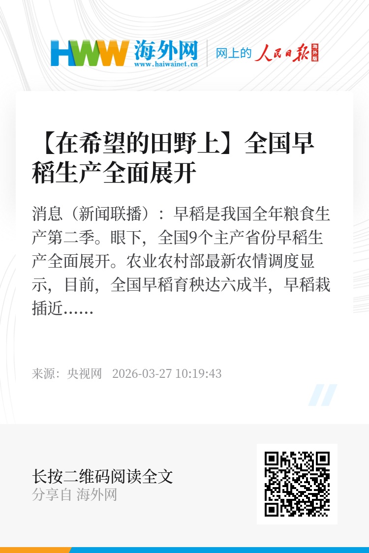 央视网消息(新闻联播):早稻是我国全年粮食生产第二季。眼下,全国9个主产省份早稻生产全面展开。