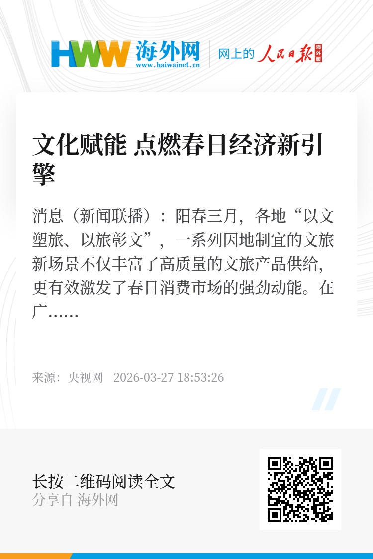央视网消息(新闻联播):阳春三月,各地“以文塑旅、以旅彰文”,一系列因地制宜的文旅新场景不仅丰富了高质量的文旅产品供给,更有效激发了春日消费市场的强劲动能。