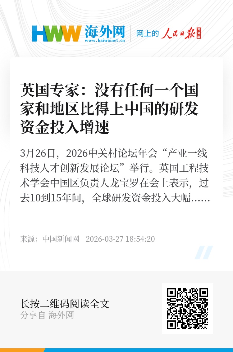 3月26日,2026中关村论坛年会“产业一线科技人才创新发展论坛”举行。英国工程技术学会中国区负责人龙宝罗在会上表示,过去10到15年间,全球研发资金投入大幅增长,中国的增速尤为突出。美国和欧洲同样在增长,但没有任何一个国家和地区,能比得上中国的增长速度。中国在全球专利数量、论文质量方面亦表现突出。(记者 刘子衿)
