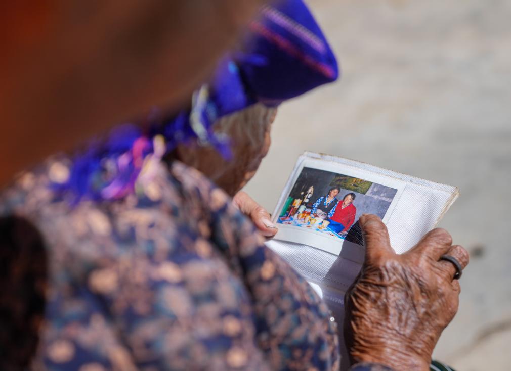 贡觉曲珍在家中翻看相册(3月6日摄)。