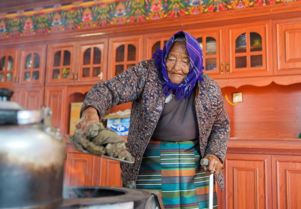 贡觉曲珍在家中给炉子添牛粪(3月6日摄)。