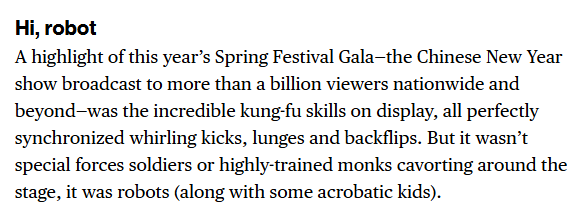 文章称,今年春晚的一大亮点,是舞台上精彩绝伦的武术表演,旋转踢腿、弓步、后空翻,所有动作都整齐划一。然而,在台上大展身手的并非特种部队士兵或训练有素的武僧,而是一群机器人。今年春晚的表演,彰显了中国自去年以来在该领域的飞速进步。而这些机器人的制造公司成立不到十年,目前已推出涵盖人形机器人和机器狗在内的丰富产品线。