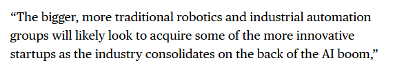 业内人士在文章中表示,随着行业的发展,投资逻辑可能会逐步从机器人本体及零部件,向其大脑、平台以及“该技术的物理AI层面”演进。“随着人工智能热潮推动行业整合,规模更大、更传统的机器人及工业自动化集团,很可能会寻求收购一些更具创新性的初创公司。”