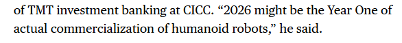 文章分析说,生成式人工智能与高端制造业的飞速进步,引起了投资者的关注,也促使企业纷纷寻求融资。中国在人形机器人领域处于全球领先地位,去年全球绝大多数的销量来自中国。瑞银集团分析师认为,机器人技术的发展之所以提速,主要得益于人工智能等技术的进步、硬件成本的大幅下降、新机型的推出以及融资活动。业内人士指出,我们正看到从“概念投资”向订单与机器人应用落地相结合的转变,“2026年可能是人形机器人真正商业化的元年。”