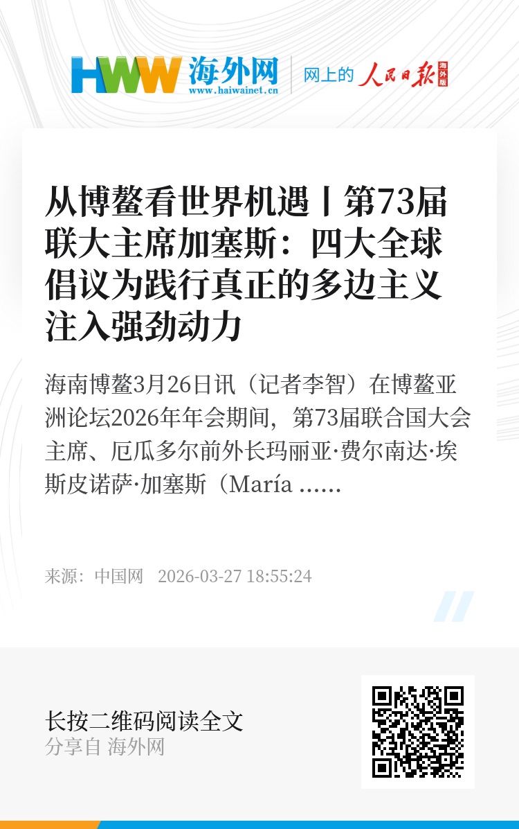 中国网海南博鳌3月26日讯(记者李智)在博鳌亚洲论坛2026年年会期间,第73届联合国大会主席、厄瓜多尔前外长玛丽亚·费尔南达·埃斯皮诺萨·加塞斯(María Fernanda Espinosa Garcés)在接受媒体记者采访时表示,世界需要践行真正的多边主义,中国在其中扮演至关重要的角色,中国提出的四大全球倡议,为此注入强劲动力。