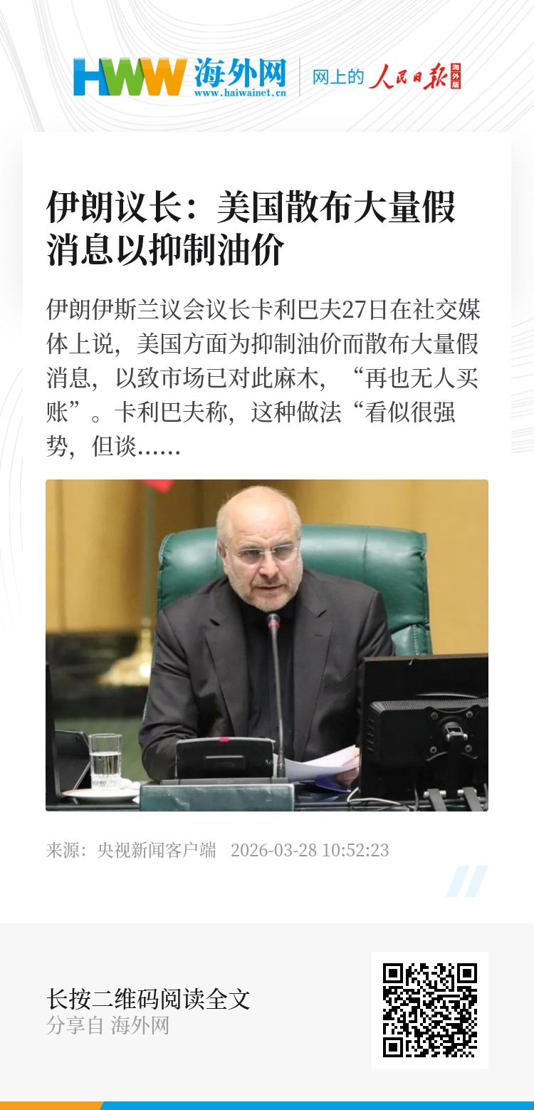 伊朗伊斯兰议会议长卡利巴夫27日在社交媒体上说,美国方面为抑制油价而散布大量假消息,以致市场已对此麻木,“再也无人买账”。