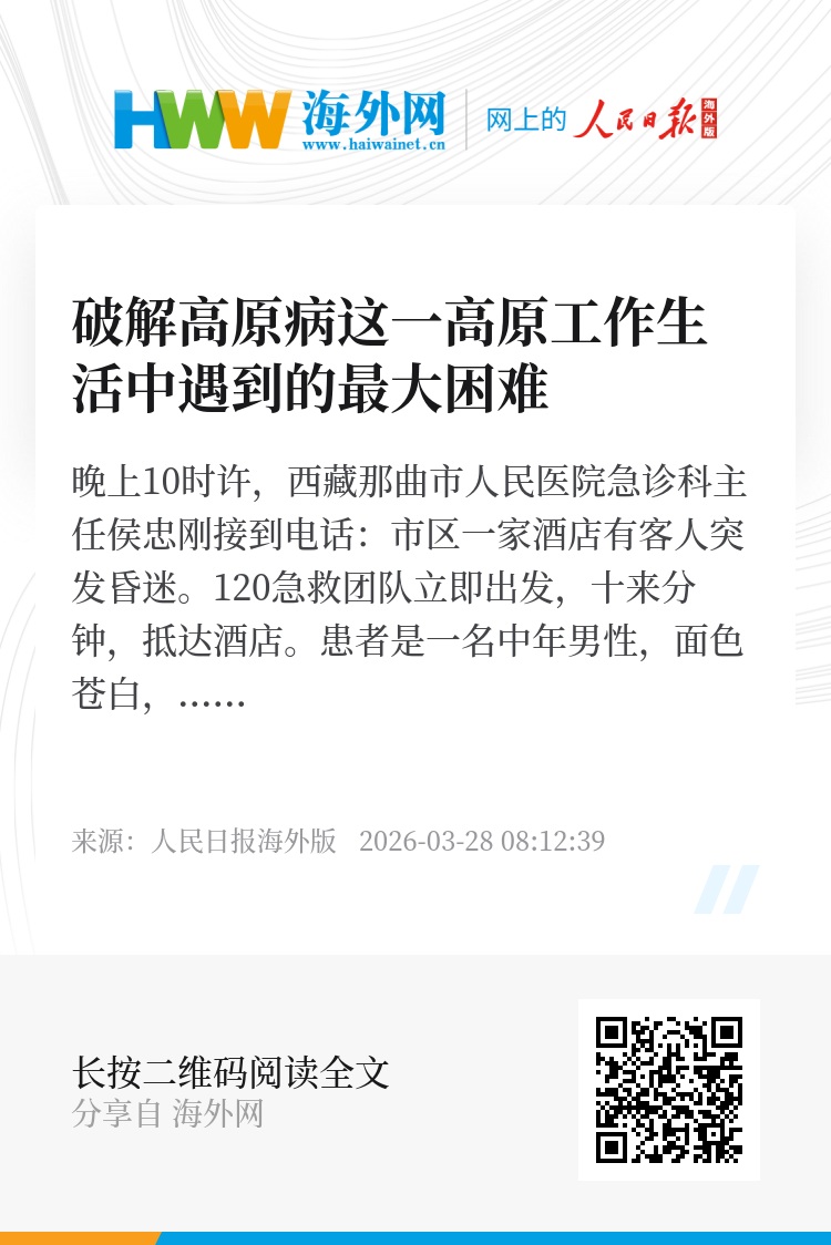 “高原气候和环境在潜移默化中对人体造成影响,进而危害健康。在高原易发生脑梗、心梗、痛风等疾病,都与此有关。”沈畅说,“像高原红细胞增多症,其实是身体为适应高原环境作出改变引发的。红细胞增多会极大增加高血压乃至中风等疾病风险,需要尽早干预。”(记者 徐驭尧)