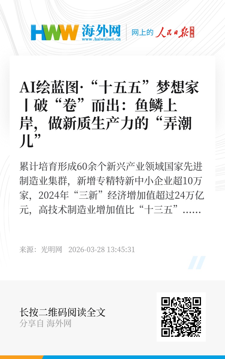 累计培育形成60余个新兴产业领域国家先进制造业集群,新增专精特新中小企业超10万家,2024年“三新”经济增加值超过24万亿元,高技术制造业增加值比“十三五”末增长42%……一条条数据,一项项成就,勾勒出中国经济高质量发展的清晰脉络与巨大潜力。“十四五”时期,坚持创新驱动引领发展,以实体经济为根基,因地制宜发展新质生产力,加快建设现代化产业体系,在向新提质、向优转型中不断培育新动能、塑造新优势。传统产业加快“焕新”,新兴产业加速“领跑”,“向新力”重塑经济发展动能,构筑竞争新优势,锻造现代化产业体系“钢筋铁骨”。