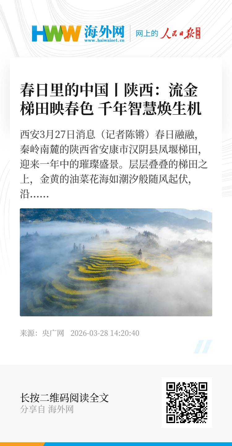 央广网西安3月27日消息(记者陈锵)春日融融,秦岭南麓的陕西省安康市汉阴县凤堰梯田,迎来一年中的璀璨盛景。层层叠叠的梯田之上,金黄的油菜花海如潮汐般随风起伏,沿凤凰山铺展,绵延至汉江河畔。这幅壮丽秀美的春日画卷,吸引着八方游客慕名而来。