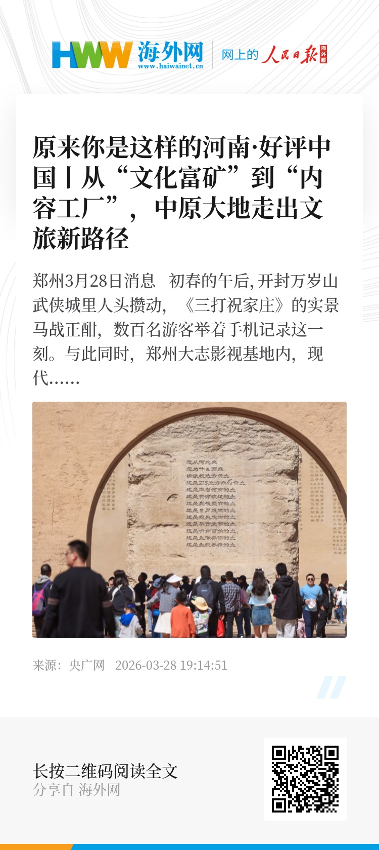 从“文化富矿”到“内容工厂”,从“厚重中原”到“文旅弄潮儿”,河南正在用自己的方式告诉世界:原来,你是这样的河南。(记者 张丽娜)