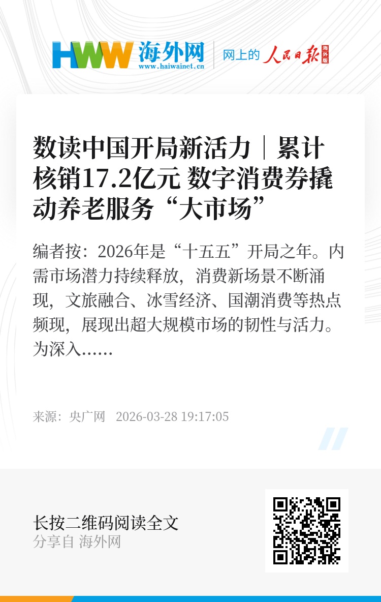 随着我国进入中度老龄化社会,深化养老服务改革发展成为实施积极应对人口老龄化国家战略的迫切要求。2026年1月1日起,面向中度以上失能老人的养老服务消费补贴在全国正式实施,最高每人每月可达800元。上海、江苏、青海等地近日纷纷发布相关数据。上海市累计为约7.8万名中度以上失能老年人发放消费券,消费券累计核销近18.7万张,核销总金额约1.3亿元,在全国位居前列。3月7日上午,十四届全国人大四次会议举行民生主题记者会。民政部部长陆治原在会上介绍,今年向中度以上失能老年人发放养老服务消费补贴,目前共累计核销消费券17.2亿元,受益老年人达89.2万人。