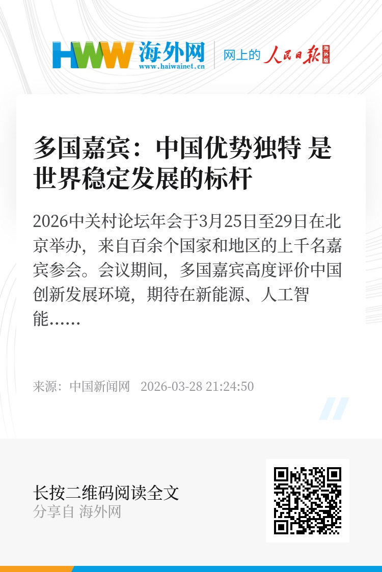 2026中关村论坛年会于3月25日至29日在北京举办,来自百余个国家和地区的上千名嘉宾参会。会议期间,多国嘉宾高度评价中国创新发展环境,期待在新能源、人工智能等领域深化合作,共享发展机遇。
