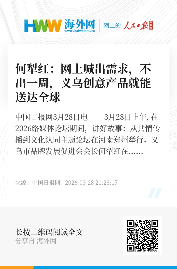 中国日报网3月28日电 3月28日上午,在2026中国网络媒体论坛期间,讲好故事:从共情传播到文化认同主题论坛在河南郑州举行。义乌市品牌发展促进会会长何犁红在主题论坛上说,义乌有着全球最成熟的供应链,品类全、反应快、创新足,网上喊出需求,不出一周,创意产品就能送达全球。更有我们自主研发的“义支付”保驾护航,解决外贸收款的痛点,让我们接海外订单更有底气。