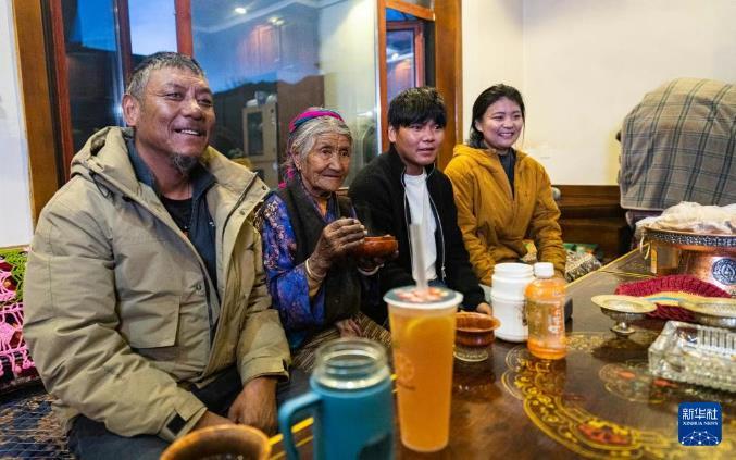 家住西藏山南市扎囊县桑耶镇的老人格桑美多,见证了西藏从封建农奴制到社会主义新天地的沧桑巨变。图为格桑美多老人(左二)和家人一起看电视。新华社发