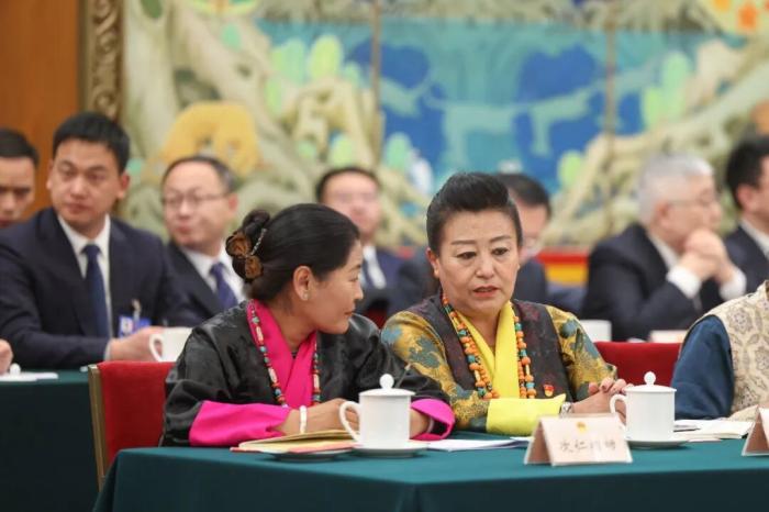 3月6日,十四届全国人大四次会议西藏代表团举行开放团组会议。图为会前,全国人大代表次仁措姆(左)和格桑卓玛交流。