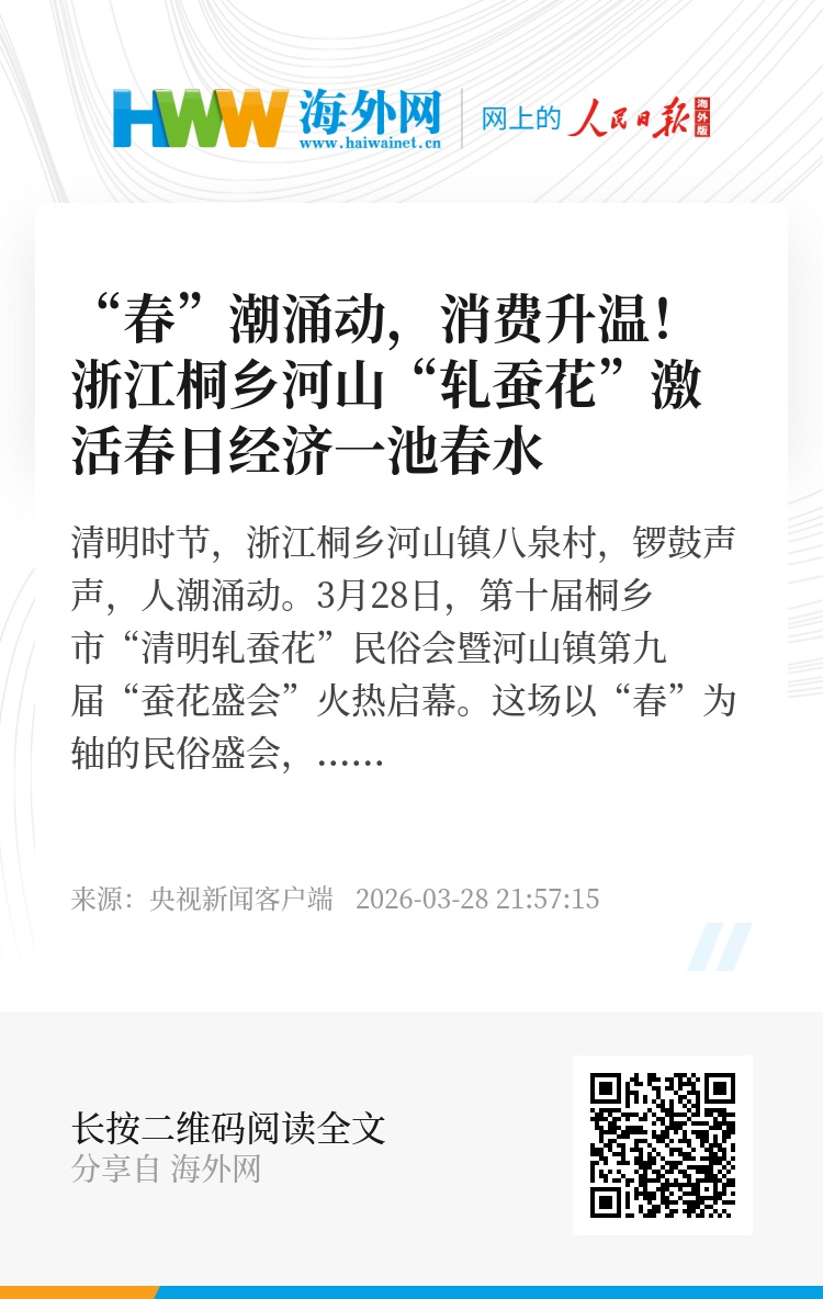 清明时节,浙江桐乡河山镇八泉村,锣鼓声声,人潮涌动。3月28日,第十届桐乡市“清明轧蚕花”民俗会暨河山镇第九届“蚕花盛会”火热启幕。这场以“春”为轴的民俗盛会,将传统蚕桑文化与现代文旅体验深度融合,为八方游客奉上一场可看、可玩、可品、可学的春日文化盛宴。