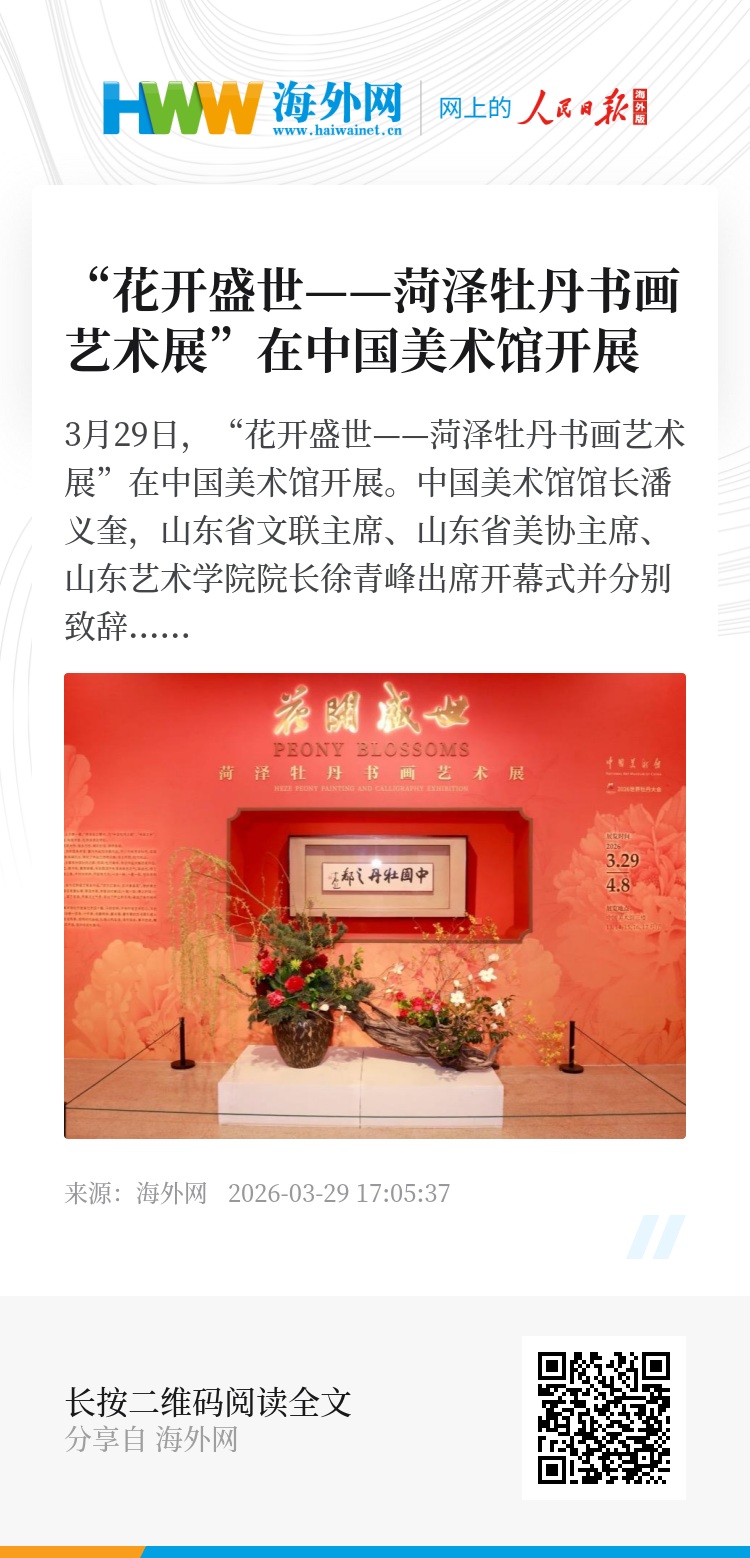 3月29日,“花开盛世——菏泽牡丹书画艺术展”在中国美术馆开展。中国美术馆馆长潘义奎,山东省文联主席、山东省美协主席、山东艺术学院院长徐青峰出席开幕式并分别致辞,中国文联副主席、中国民间文艺家协会主席潘鲁生宣布展览开幕,中国美术家协会分党组书记、驻会副主席屈健,山东省委宣传部副部长、省电影局局长、一级巡视员程守田出席开幕式。菏泽市人大常委会主任王磊出席活动并致辞,市委常委、宣传部部长曹临主持开幕式,副市长冯艳丽参加活动。