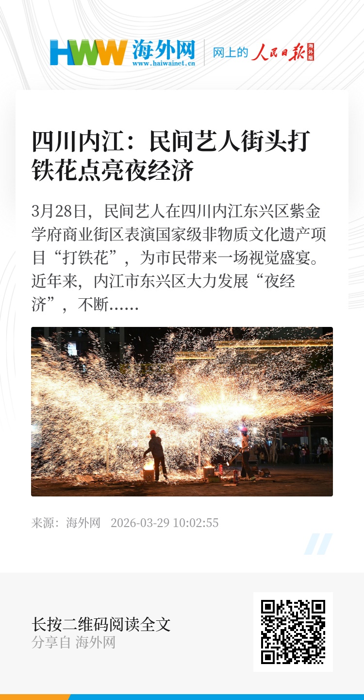 3月28日,民间艺人在四川内江东兴区紫金学府商业街区表演国家级非物质文化遗产项目“打铁花”,为市民带来一场视觉盛宴。近年来,内江市东兴区大力发展“夜经济”,不断推出集文娱、美食、购物等多种元素于一体的夜间消费活动,为县域经济发展注入新动能。图源:视觉中国
