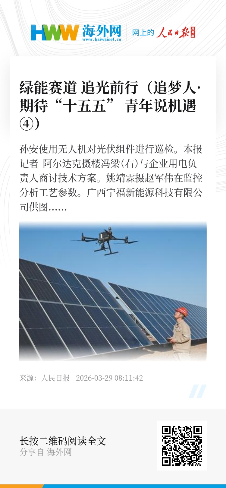 “新能源是年轻的事业,更是属于年轻人的事业。”孙安说,“‘十五五’的蓝图已经绘就,清洁能源的舞台足够宽广,期待更多青年加入我们追光者的行列,在戈壁、在高原、在海上风场,在能源转型的每一个前沿阵地,找到属于自己的机遇,绽放青春的光芒。”