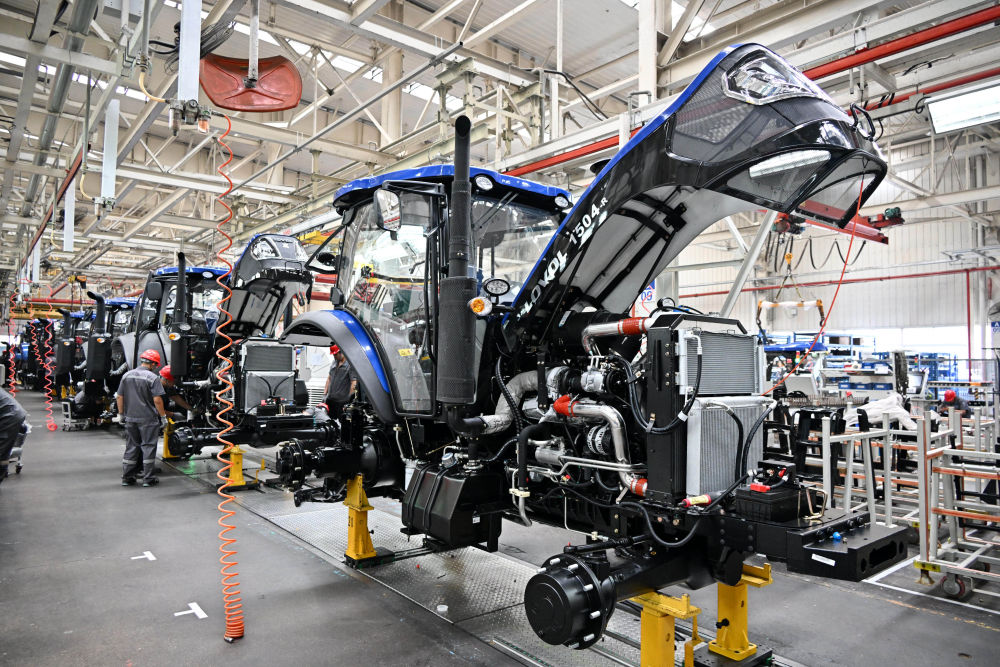 在潍柴雷沃智慧农业科技股份有限公司拖拉机工厂,工人在装配智能拖拉机(2024年8月21日摄)。新华社记者 李紫恒 摄