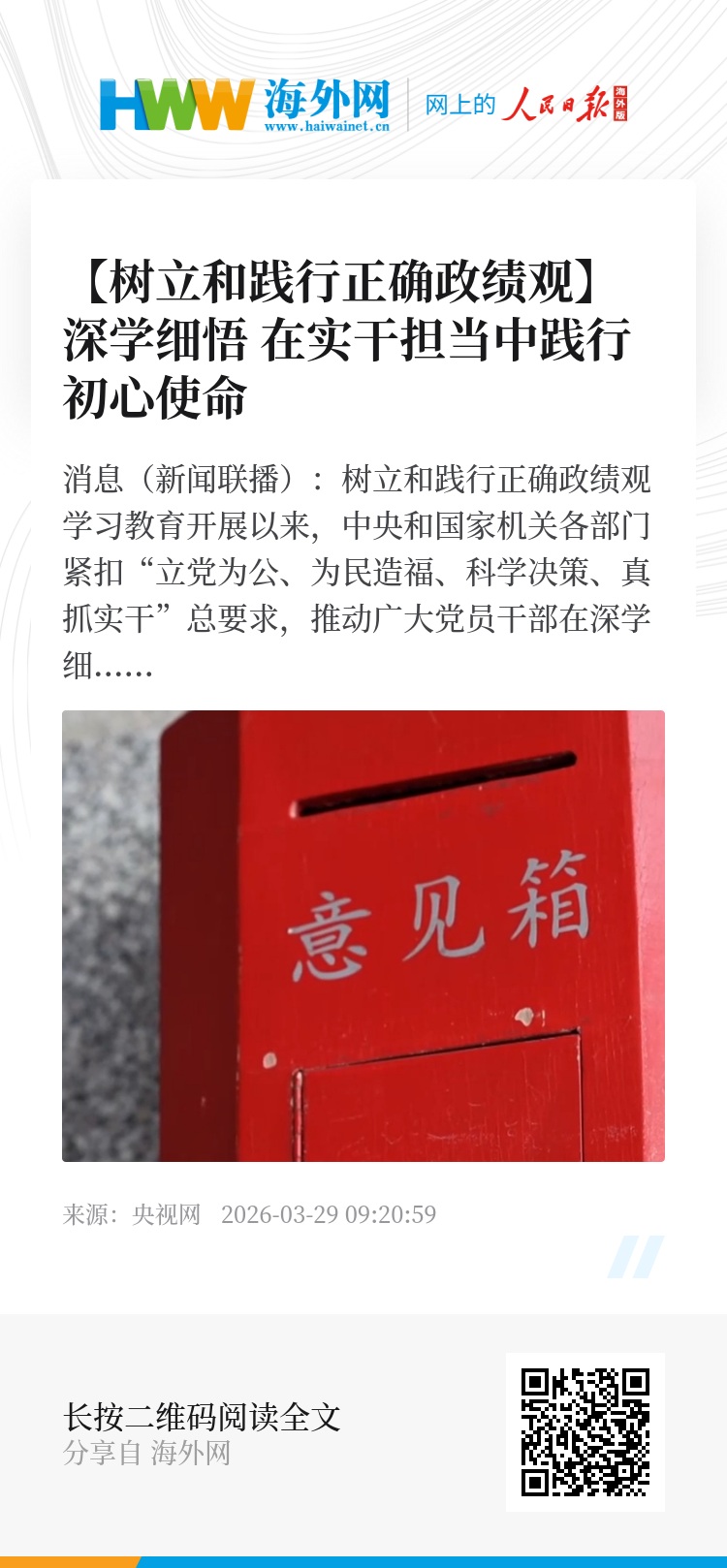 央视网消息(新闻联播):树立和践行正确政绩观学习教育开展以来,中央和国家机关各部门紧扣“立党为公、为民造福、科学决策、真抓实干”总要求,推动广大党员干部在深学细悟中筑牢思想根基,在实干担当中践行初心使命。