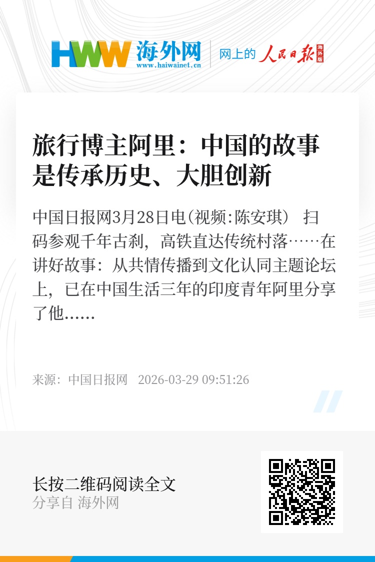 中国日报网3月28日电(视频:陈安琪) 扫码参观千年古刹,高铁直达传统村落……在讲好故事:从共情传播到文化认同主题论坛上,已在中国生活三年的印度青年阿里分享了他游在中国的惊喜和体会。他说,在中国,科技与传统紧密联系,而中国的故事不是抹掉历史,而是传承历史、大胆创新。对他来说,真正了解并理解中国的方式,是用自己的眼睛、脚步和开放的心来感受。