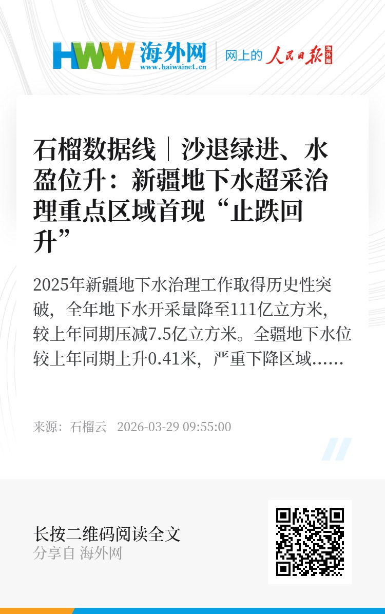 新疆地下水超采治理实现新突破,重点区域地下水位止跌回升,生态持续向好,沙化土地减少,实现了“沙退绿进”的良性循环。