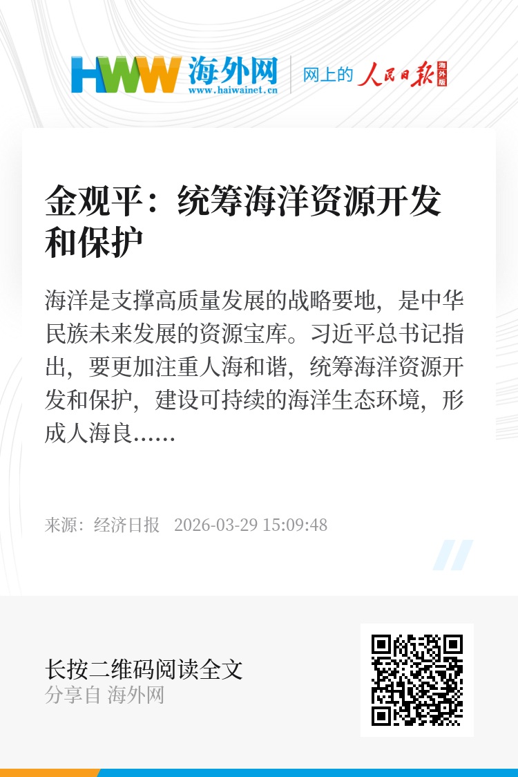 做好海洋资源开发与保护是一项长期任务,重在统筹、贵在坚持。要切实把统筹开发保护贯穿海洋产业发展、科技创新、生态治理全过程,稳步提升海洋经济发展质效,持续改善海洋生态环境,让蓝色国土永葆生机活力。(本文来源:经济日报 作者:金观平)