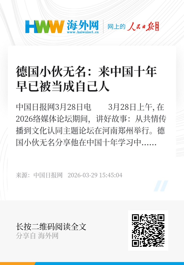 中国日报网3月28日电 3月28日上午,在2026中国网络媒体论坛期间,讲好故事:从共情传播到文化认同主题论坛在河南郑州举行。德国小伙无名分享他在中国十年学习中医的经历。从听不懂老中医的河南话,到成为学弟学妹的方言翻译。他坦言,深入学习语言与当地人文后,越发觉得人与人之间的差异本就微小。而这份真诚的融入,也让他被河南乡亲视作自己人。