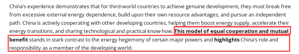 文章总结说,中国的实践表明:发展中国家要实现真正发展,必须摆脱过度外部能源依赖,立足自身资源优势走独立自主道路。中国正积极与其他发展中国家合作,通过技术共享、经验输出帮助其提升能源供给能力、加快能源转型步伐。这种平等合作、互利共赢的模式,既区别于某些大国的能源霸权主义,也彰显了中国作为发展中世界一员的责任担当。