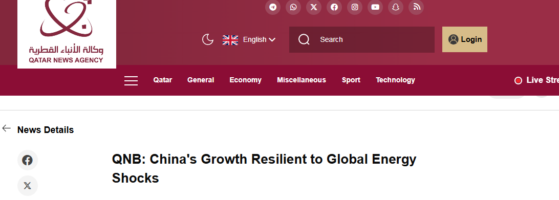 卡塔尔通讯社28日援引卡塔尔国家银行出炉的最新报告指出,尽管地缘政治紧张局势加剧与全球能源市场波动,中国经济仍展现出显著抗风险能力。报告认为,中国能源结构多元化、石油依赖度较低及战略储备雄厚等结构性优势,能有效缓冲能源价格上涨冲击。