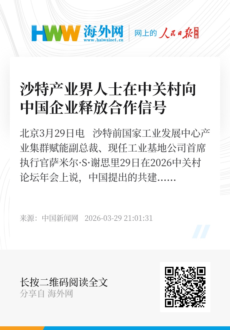 中新网北京3月29日电 沙特前国家工业发展中心产业集群赋能副总裁、现任工业基地公司首席执行官萨米尔·S·谢思里29日在2026中关村论坛年会上说,中国提出的共建“一带一路”倡议与沙特“2030愿景”不仅是并行战略,更完美契合。