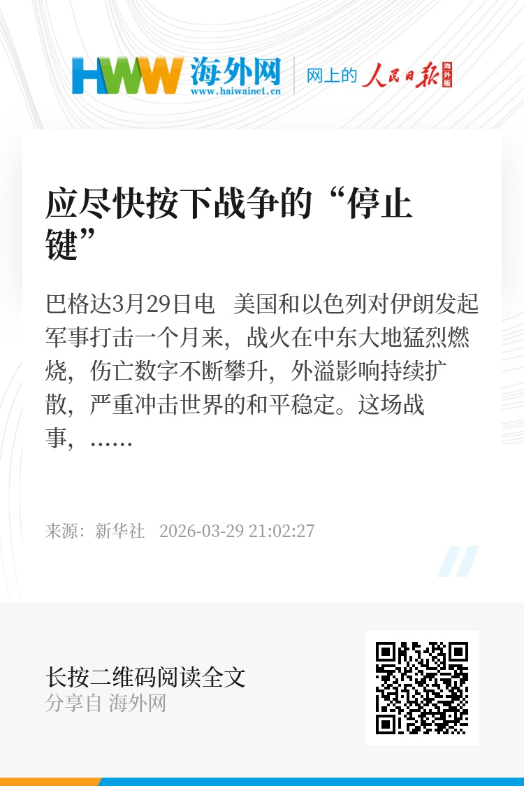 新华社巴格达3月29日电 美国和以色列对伊朗发起军事打击一个月来,战火在中东大地猛烈燃烧,伤亡数字不断攀升,外溢影响持续扩散,严重冲击世界的和平稳定。这场战事,正将中东再次推向动荡深渊,也让世界为强权政治的任性付出沉重代价。越是在这样的时刻,越要清醒认识到:武力解决不了问题,按下“停止键”刻不容缓。