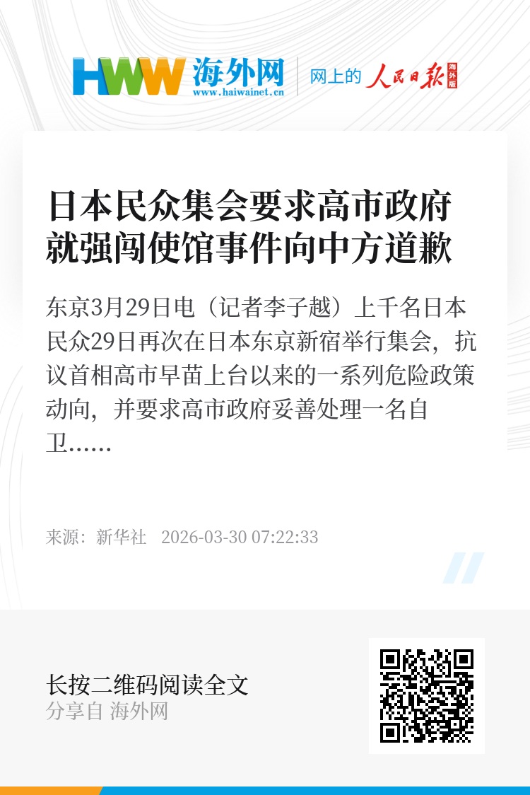 新华社东京3月29日电(记者李子越)上千名日本民众29日再次在日本东京新宿举行集会,抗议首相高市早苗上台以来的一系列危险政策动向,并要求高市政府妥善处理一名自卫队官员强闯中国驻日本大使馆事件,立即向中方道歉。