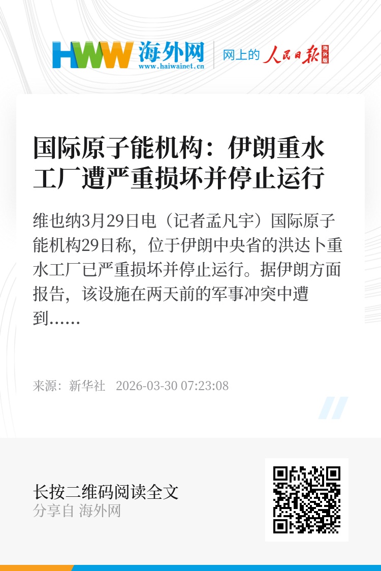 新华社维也纳3月29日电(记者孟凡宇)国际原子能机构29日称,位于伊朗中央省的洪达卜重水工厂已严重损坏并停止运行。据伊朗方面报告,该设施在两天前的军事冲突中遭到袭击。
