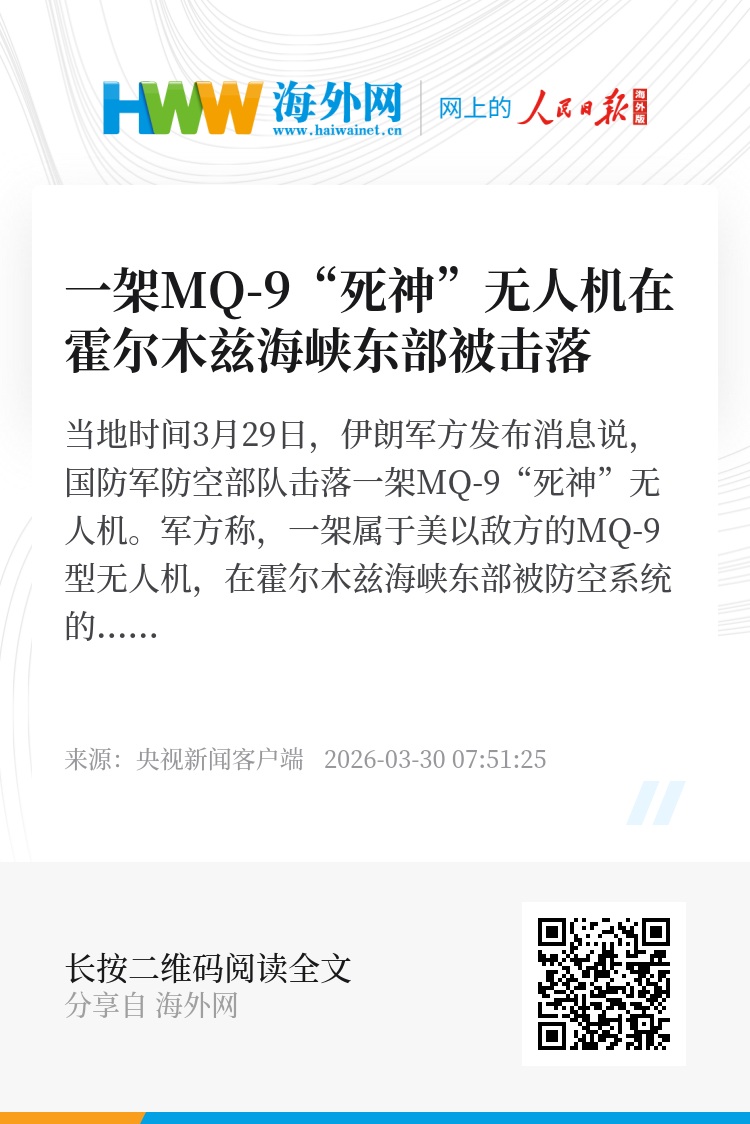 当地时间3月29日,伊朗军方发布消息说,国防军防空部队击落一架MQ-9“死神”无人机。