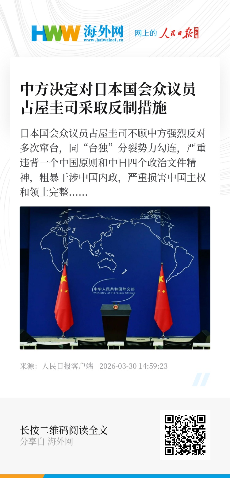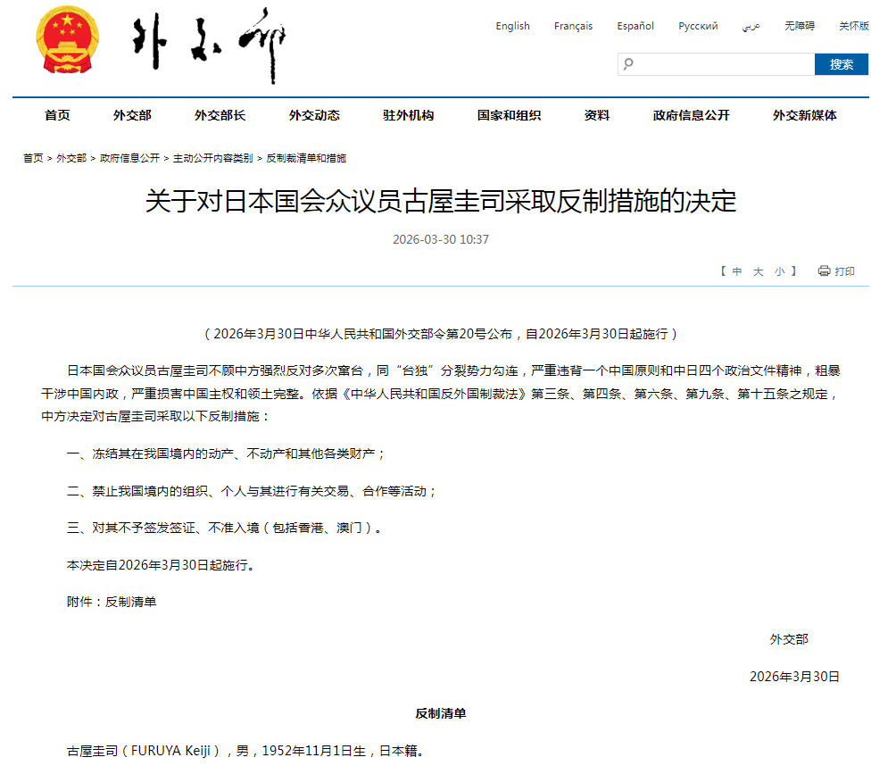 日本国会众议员古屋圭司不顾中方强烈反对多次窜台,同“台独”分裂势力勾连,严重违背一个中国原则和中日四个政治文件精神,粗暴干涉中国内政,严重损害中国主权和领土完整。依据《中华人民共和国反外国制裁法》第三条、第四条、第六条、第九条、第十五条之规定,中方决定对古屋圭司采取以下反制措施: