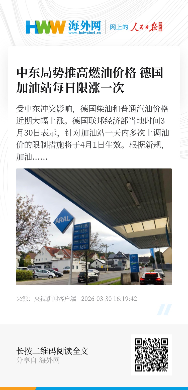 受中东冲突影响,德国柴油和普通汽油价格近期大幅上涨。德国联邦经济部当地时间3月30日表示,针对加油站一天内多次上调油价的限制措施将于4月1日生效。