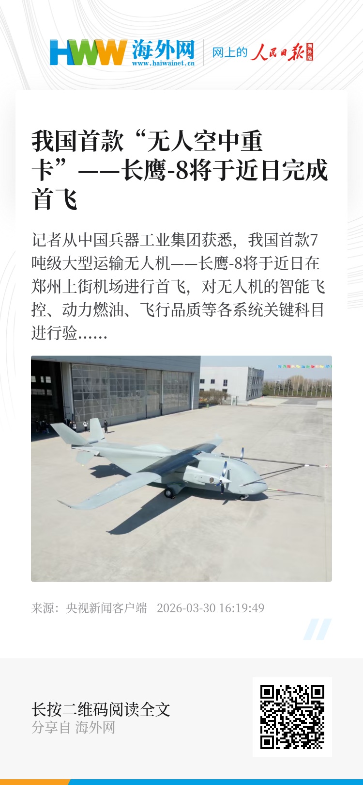 记者从中国兵器工业集团获悉,我国首款7吨级大型运输无人机——长鹰-8将于近日在郑州上街机场进行首飞,对无人机的智能飞控、动力燃油、飞行品质等各系统关键科目进行验证,目前首飞各项工作准备就绪。