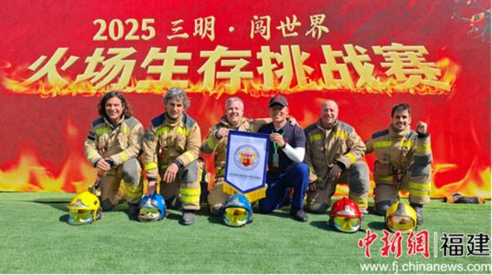 吕志龙(右三)与三明·闯世界火场生存挑战赛国外参赛者合影。三明市消防救援支队供图