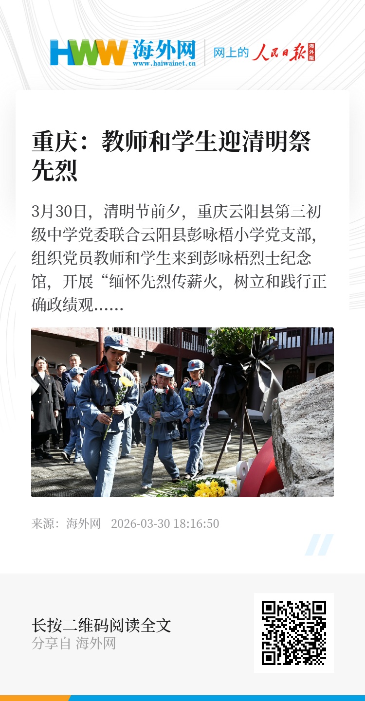 3月30日,清明节前夕,重庆云阳县第三初级中学党委联合云阳县彭咏梧小学党支部,组织党员教师和学生来到彭咏梧烈士纪念馆,开展“缅怀先烈传薪火,树立和践行正确政绩观”红色主题教育党日活动。图源:视觉中国