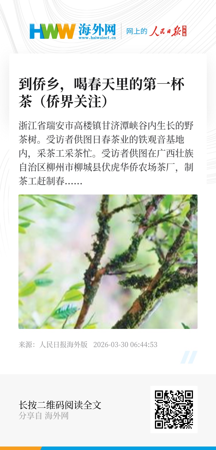 阳春二三月,侨乡的茶园陆续进入春茶采收季。茶农指尖撷翠,收获春日里的第一份鲜爽。近日,本报记者走进浙江、福建、广西等地的侨乡,寻找茶山,对话茶人,探寻一片茶叶背后的侨乡风土故事。