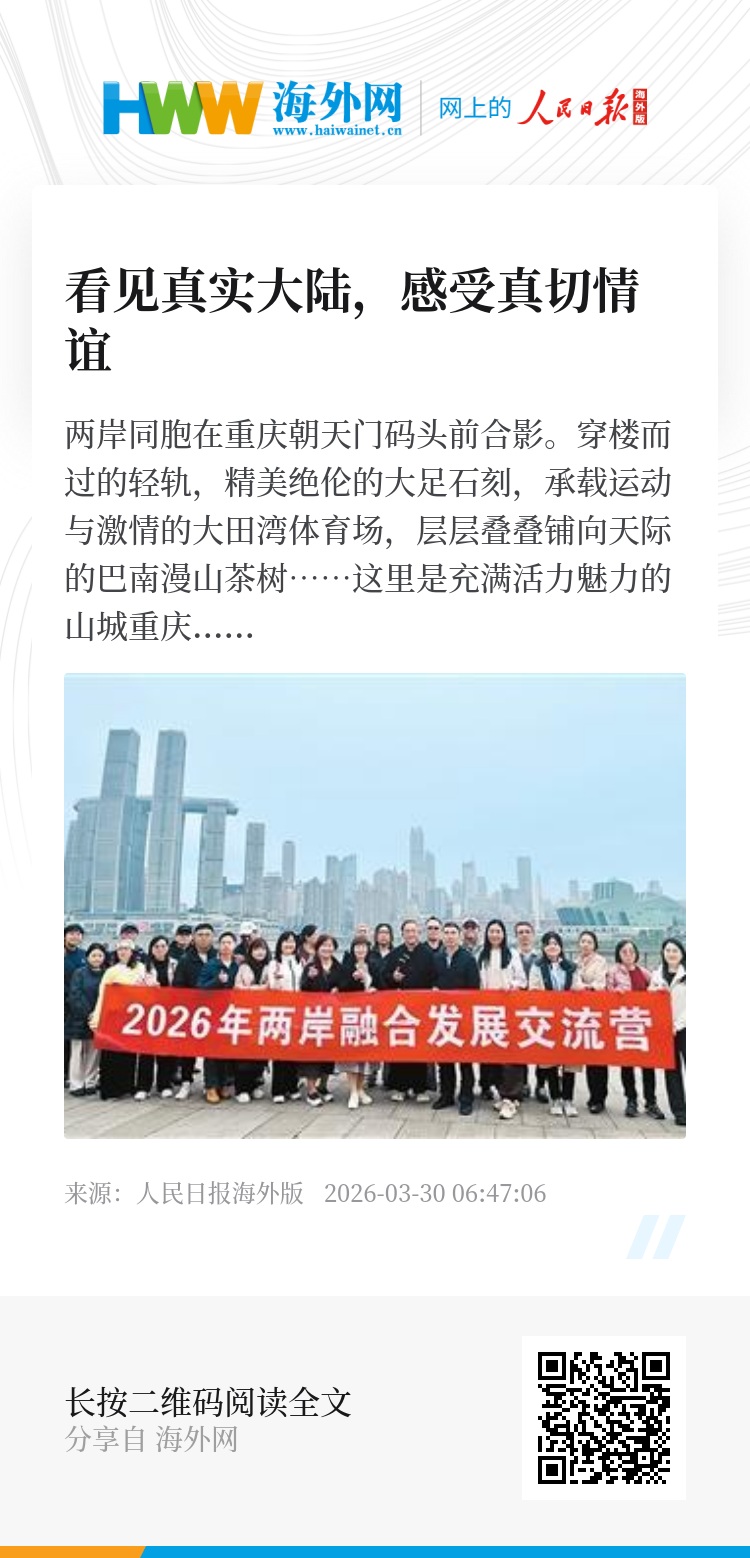 近日,由台盟中央和全国台联主办的2026年两岸融合发展交流营重庆体育文化研习营在渝举办,70余名台湾青年及各界人士欢聚重庆,开展为期6天的体育文化交流活动,亲身感受大陆的发展进步和重庆的独特魅力,感受大陆同胞的淳朴热忱和“两岸一家亲”的真切情谊。