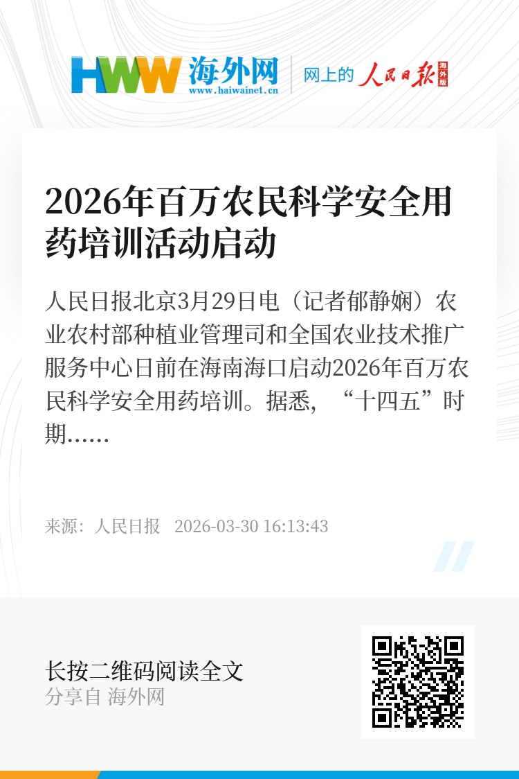 人民日报北京3月29日电(记者郁静娴)农业农村部种植业管理司和全国农业技术推广服务中心日前在海南海口启动2026年百万农民科学安全用药培训。据悉,“十四五”时期,全国年均培训7万余场、超700万人次,农民根据农药标签用药的比例较“十三五”末提高了30个百分点,培训活动取得显著成效,农民科学安全用药能力显著提升。