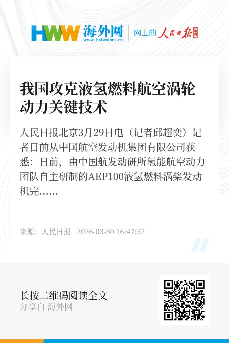 人民日报北京3月29日电(记者邱超奕)记者日前从中国航空发动机集团有限公司获悉:日前,由中国航发动研所氢能航空动力团队自主研制的AEP100液氢燃料涡桨发动机完成了基于地面试验环境的点火与性能调试试验,试验期间发动机及液氢输运系统各项指标正常,在全状态下运行稳定,实现了国内首次兆瓦级液氢燃料航空发动机整机性能达标。