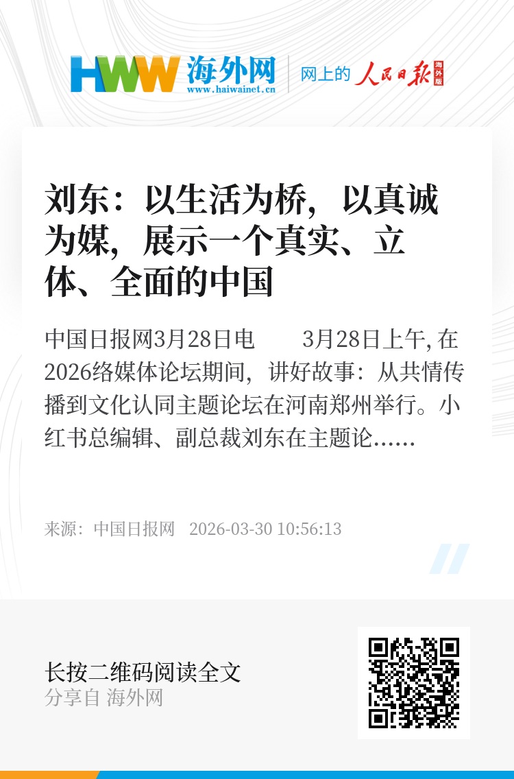 中国日报网3月28日电 3月28日上午,在2026中国网络媒体论坛期间,讲好故事:从共情传播到文化认同主题论坛在河南郑州举行。小红书总编辑、副总裁刘东在主题论坛上说:作为生活社区平台,小红书一直在思考:如何展示一个真实、立体、全面的中国?我们的答案是——以生活为桥,以真诚为媒。