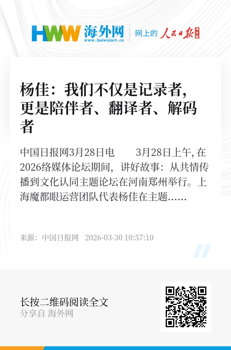 中国日报网3月28日电 3月28日上午,在2026中国网络媒体论坛期间,讲好故事:从共情传播到文化认同主题论坛在河南郑州举行。上海魔都眼运营团队代表杨佳在主题论坛上说:为了让“老外”加速变成“老内”,在选择“旅行者”、设计“旅程”时,我们关心他们在拍摄完以后,如何理解这座城市?如何理解当下的中国?我们坚定地相信,第一次来华的年轻人有着未知与好奇,拥有对海外传播天然的“共同话语”。年轻人更直接,不掩饰惊讶与困惑。这让我们不仅是记录者,更是陪伴者、翻译者、解码者。