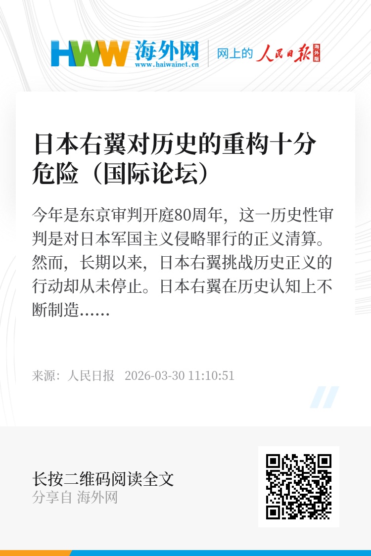 日本右翼对历史的重构十分危险。若不加阻击,这种危险做法必将深度介入现实世界,冲击亚洲的和平稳定。历史不容虚假重构。日本只有正确看待历史,才能开创未来。