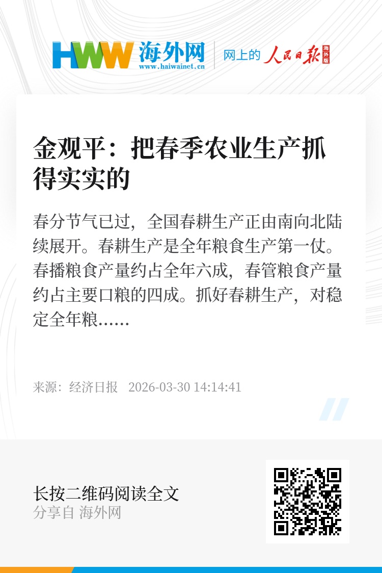 各地区各部门要坚决扛起保障国家粮食安全责任,精细抓好春管春耕,力争夏季粮油再获丰收,夯实全年粮食生产基础,助力“十五五”良好开局。(本文来源:经济日报 作者:金观平)