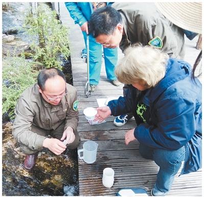 克罗地亚普湖公园保护与可持续利用部主任卡齐米尔·米库利尼奇在中国黄龙国家自然保护区采集水样。